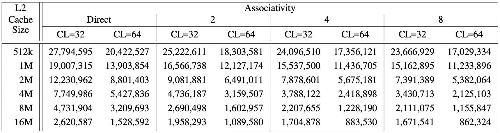 The table shows L2 cache miss counts across varying cache size, associativity, and cache line size. Lower numbers are better.
