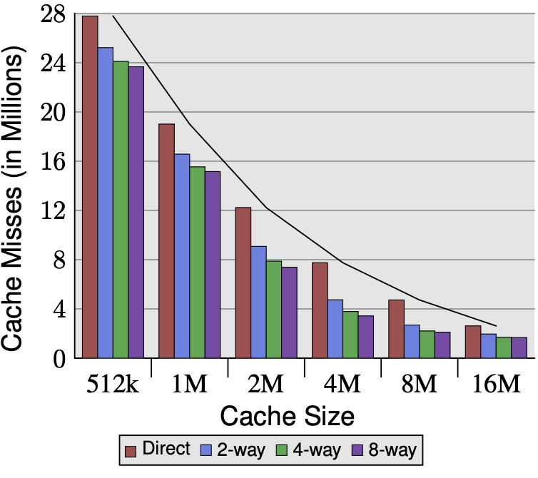 Associativity only helps when conflict misses are the bottleneck. For small caches where the working set doesn’t fit, more ways reduce conflicts meaningfully. For large caches where it does fit, associativity gains nearly vanish — capacity is the constraint, not conflicts.
