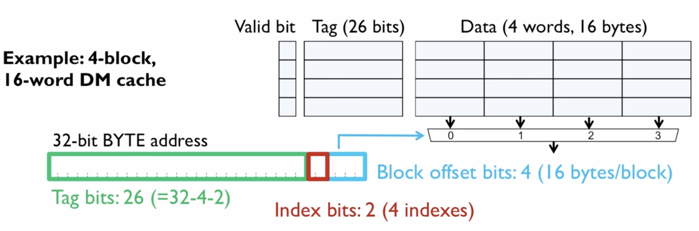 - Offset: log₂(4) = 2 bits — selects byte within a cache line