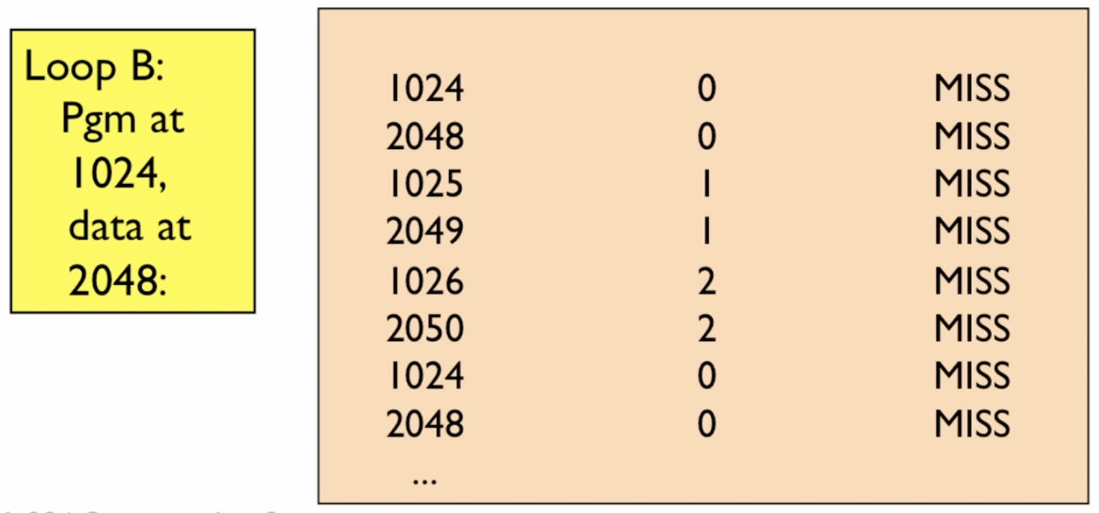Consider a 1024-line DM Cache with block size = 1 word. If we have a loop in a program that accesses 2 regions in physical memory that correspond to the same cache line, they will be competing for the same cache line slot, leading to repeated misses!