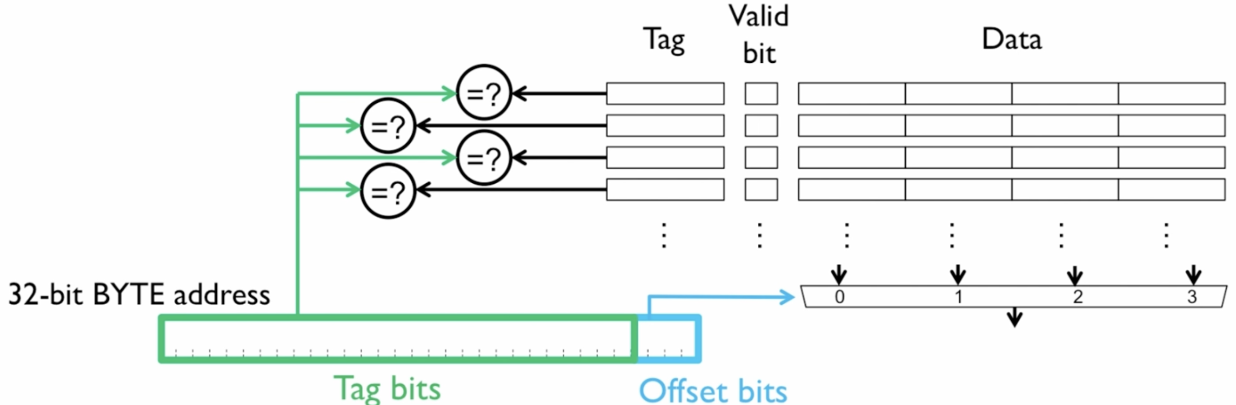 Example: 32-bit address, 4-byte cache lines (so 2 offset bits), say 4 cache lines total.