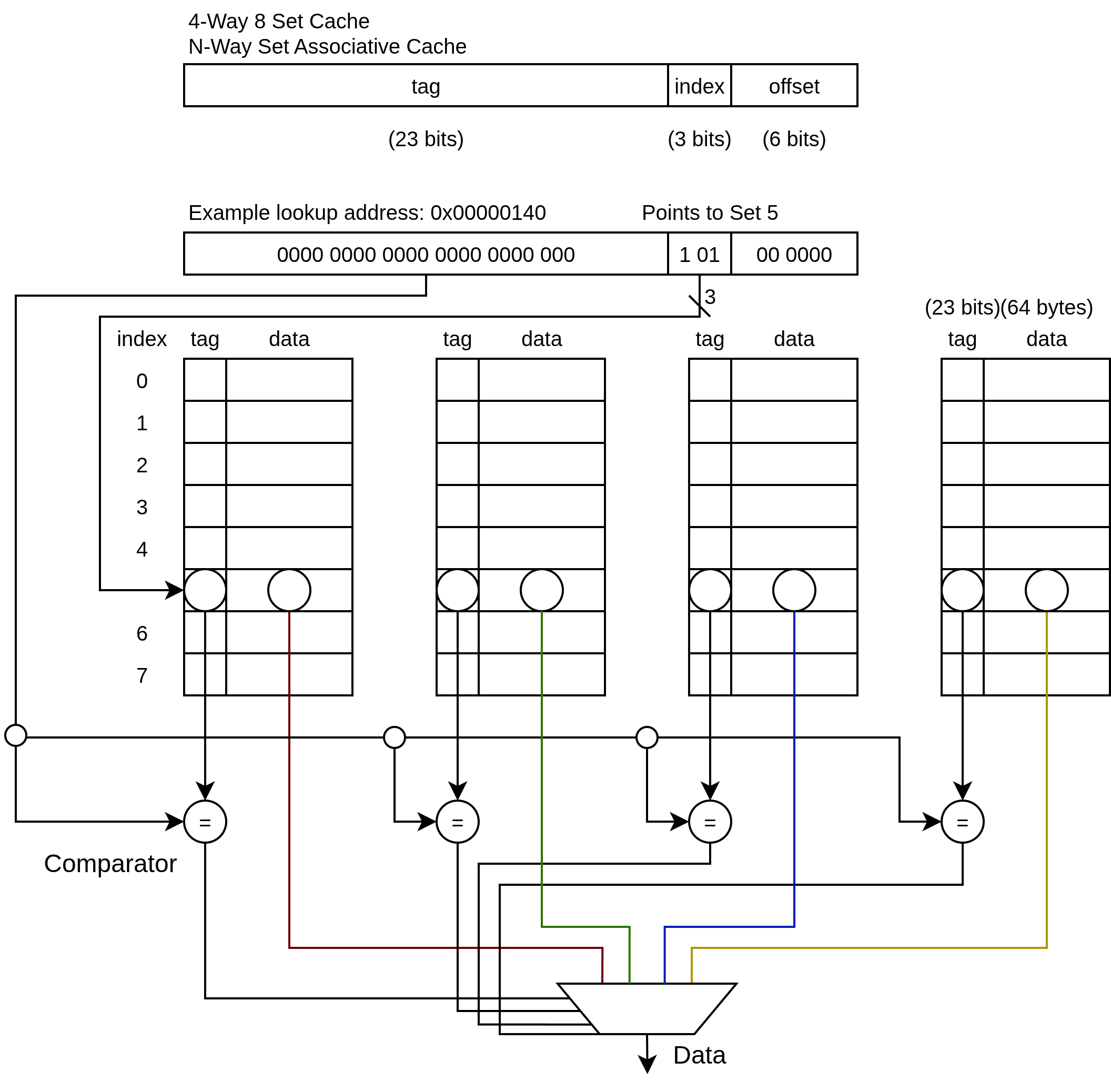 - Index bits select set 5 - narrows you to one row across all 8 sets