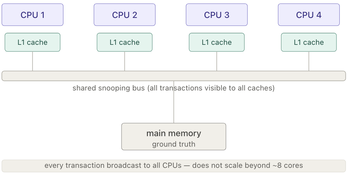- A Modified line is snooped — the owner flushes to RAM before the requesting CPU can proceed