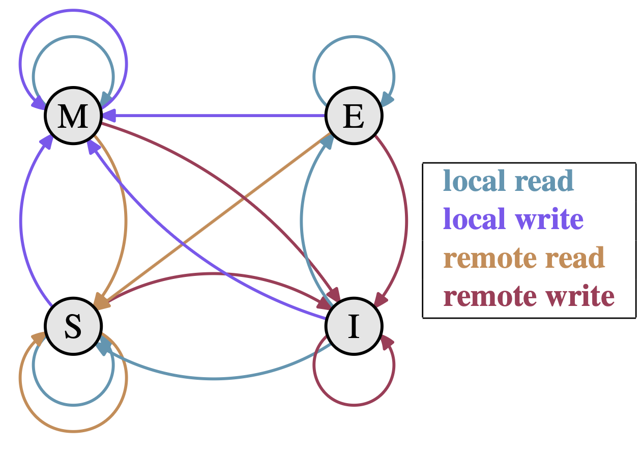 | Invalid | PrRd | Issue BusRd on bus. Others check if they have a valid copy and inform sender. → S if another cache has a copy; → E if none (must wait for all to report). Data supplied by another cache or fetched from main memory. |