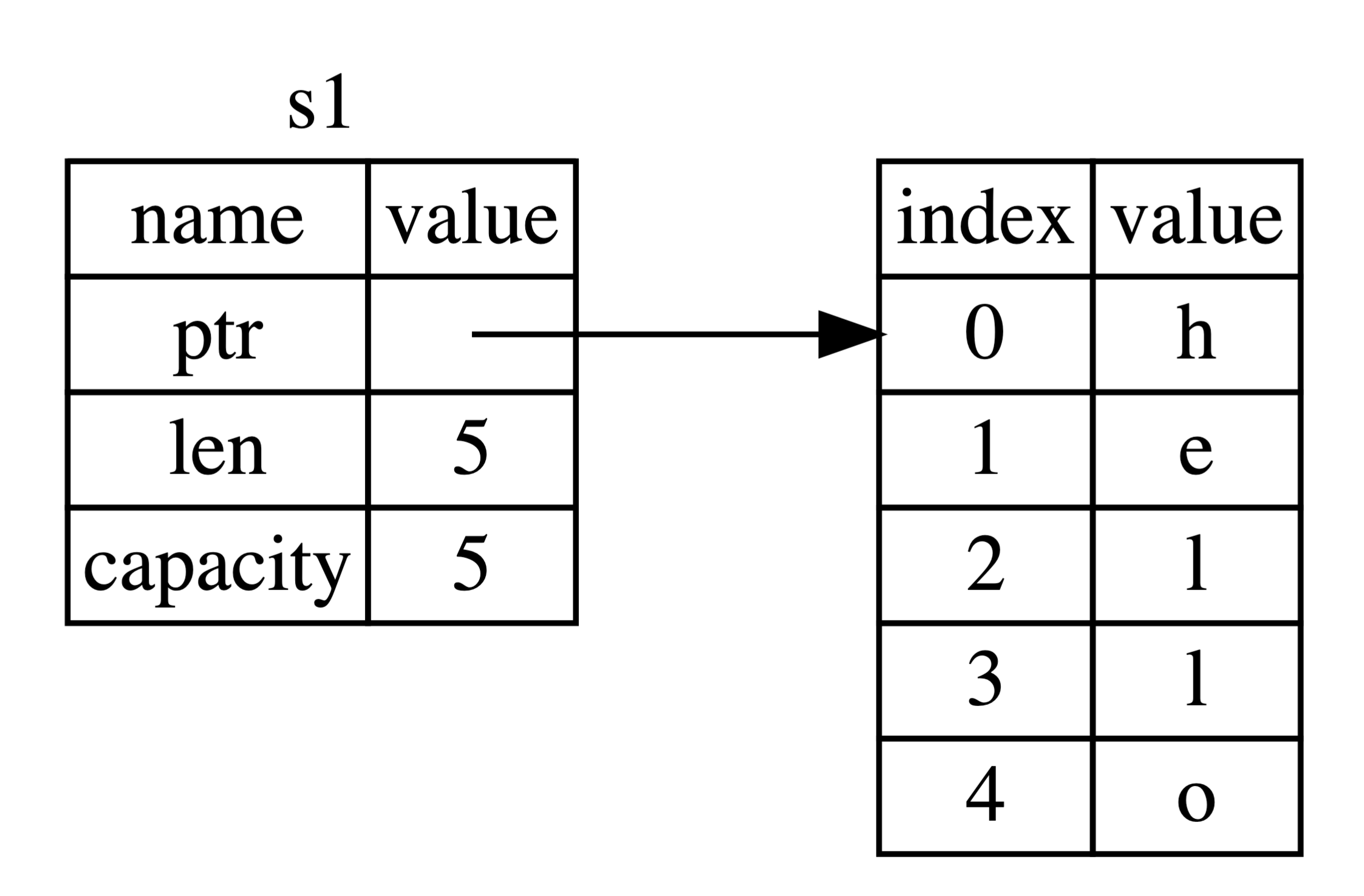 As can be seen, s1 is stored on the stack, and contains a pointer to the string “hello” stored on the heap, and thus is considered its owner. As std::string follows RAII, once s1 goes out of scope, its heap allocated “hello” gets deleted as well.